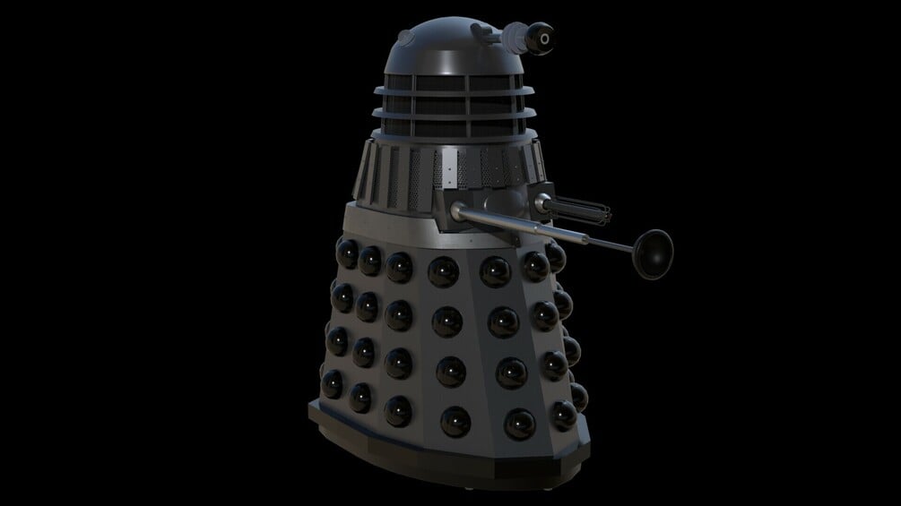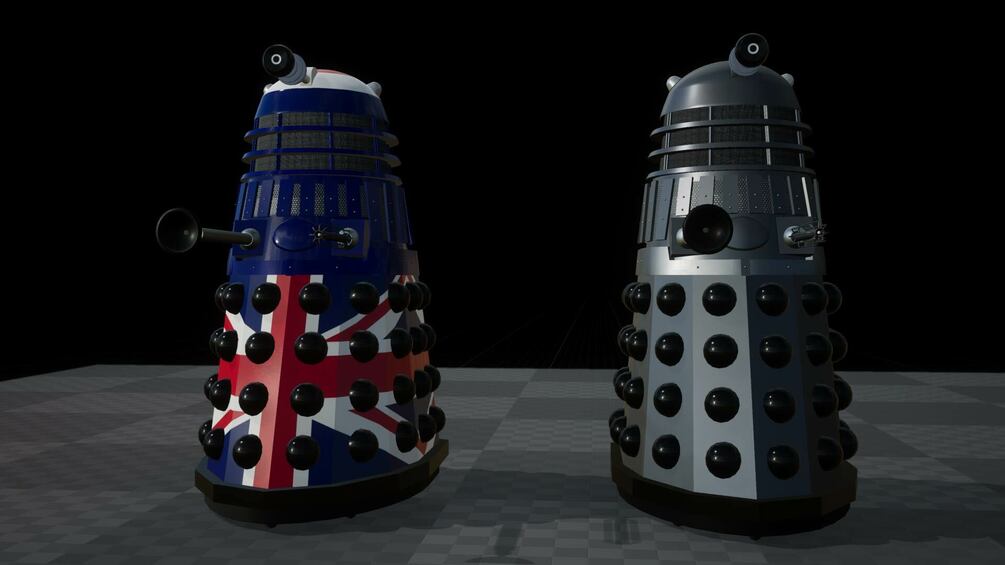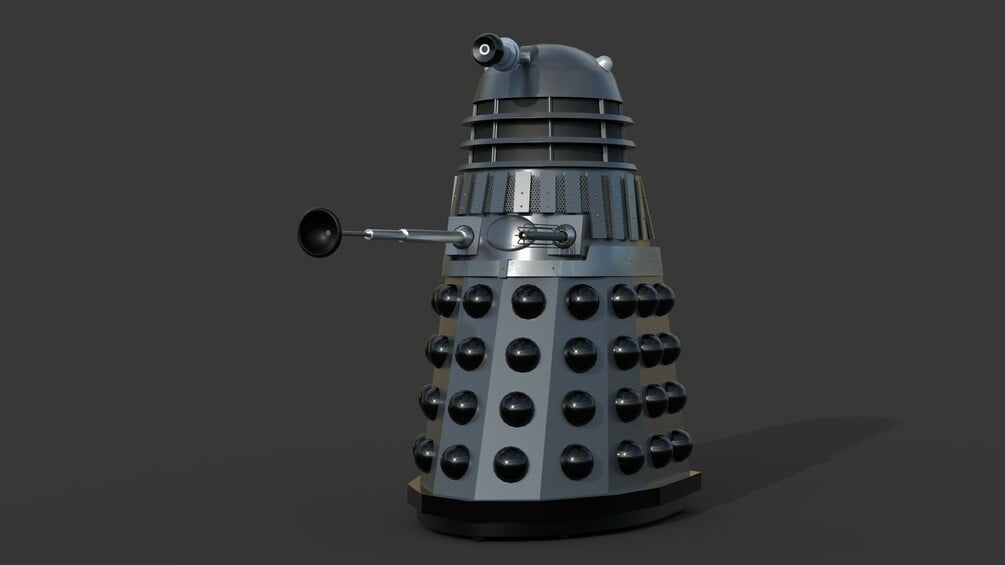 This Maya 2020 rig of a 70’s-era dalek from the Doctor Who TV series has 4K PBR maps set up for rendering in Arnold 5. Two separate Maya rigs are optimized for animating specifically for UE4 and Maya. Two different texture options are included: classic and Union Jack. The rig has controls for the head (rotate), eye stalk (rotate), arm (rotate/telescope) and gun (rotate/extend “flower”) as well as the master scale/translate control. The head indicators can be animated to blink using the Emission channel of its material.