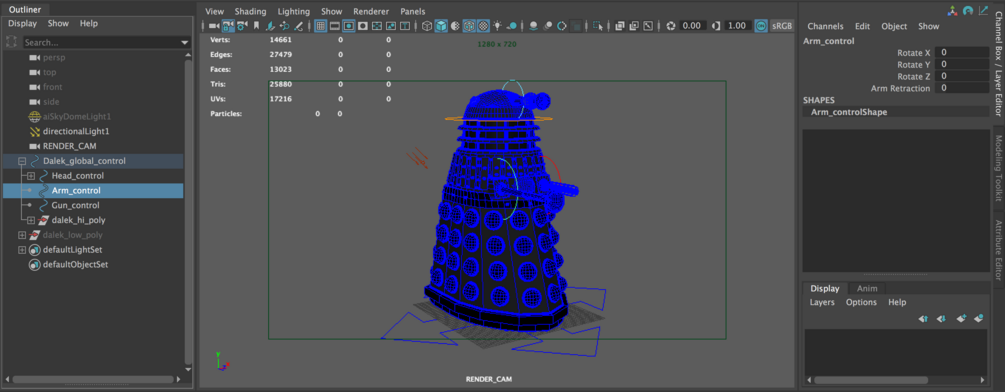 - Maya scene files (.ma, .mb) with high-poly rig with controls for arm/extension, gun, eye and head rotation. Two rig versions in separate files are optimized for animating for Maya renders (dalek_Maya_rig.mb) or for UE4 (dalek_UE4_rig.mb) export. Arnold materials are set up using the PBR maps.